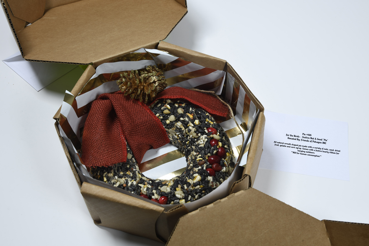 All natural wreath shaped pie made with a variety of nuts, seed, dried fruit, gelatin and corn syrup. Comes with a festive hearty ribbon for hanging outdoors.