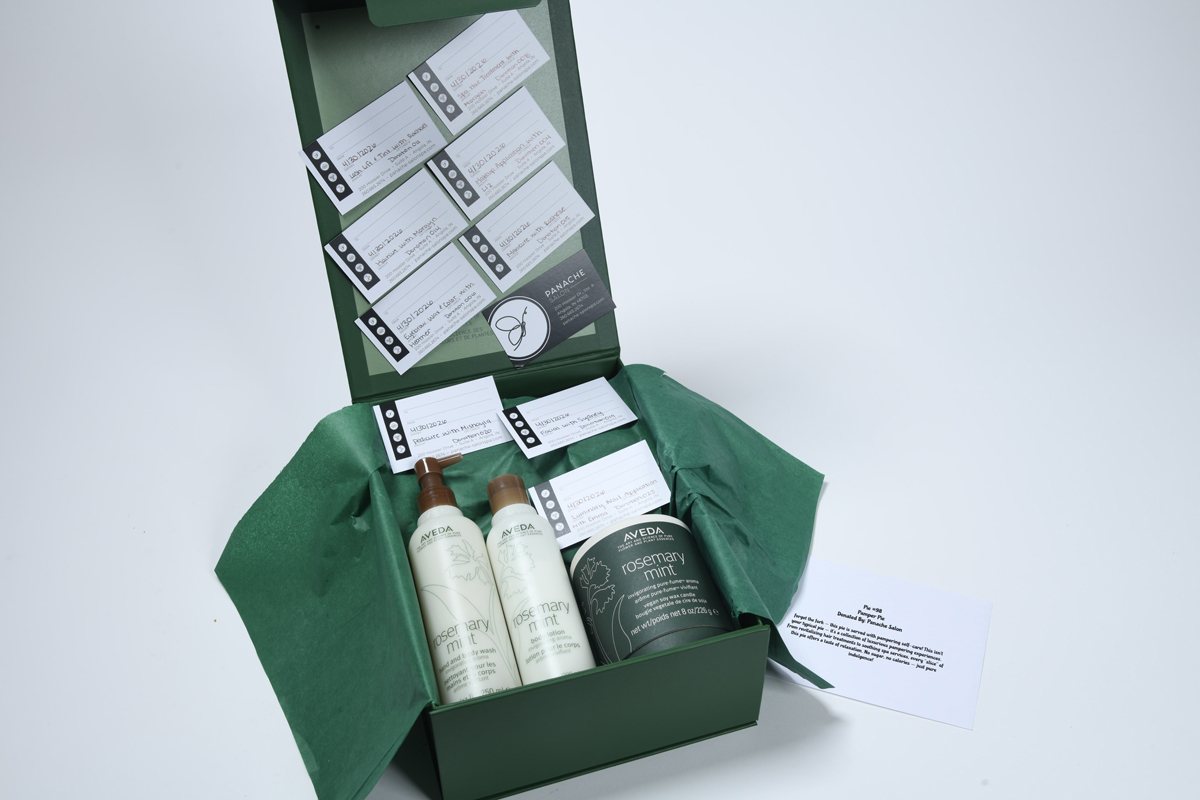 This pie includes: Rosemary Mint Hand & Body Wash, Body Lotion, and Candle set. Services: Lash Lift & Tint with Rachael, Spa Hair Treatment with Morgan, Makeup Application with Liz, Haircut with Morgyn, Eyebrow Wax & Color with Heather, Manicure with Roshelle, Pedicure with Mishayla, Facial with Sydney, and Luminary Nail Application with Emma! Total value of over $600!